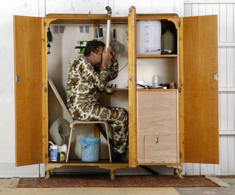 Norton makes work about rockets and meteorites, improbable crop circles, retro nuclear technology and how to survive in the event of finding oneself in an inhospitable situation. He can teach us—in the event of the world gone mad or technology turned bad —how to make suitcases float, how to live for a fortnight within a wardrobe, and how to hide in the foothills of Everest, the sandy enclave of Cronulla Beach or the pages of a lined A4 sheet. His work is comforting, it is useful and it comes from a genuine and beguiling paranoia. He doesn’t believe us to be safe, or ‘alone’ and he will continue stocking supplies, stitching the camo and reversing the heels of his shoes in readiness for the invasion.