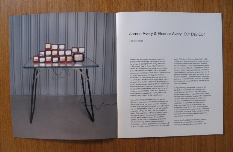 The multiple and shifting manifestations of the contemporary ‘landscape’ form a fertile site for the critique of perception and reality in the work of Eleanor and James Avery. Their improbable towers of makeshift props and brazen monuments to the interventions of tourism offer us a parallel environment, constructed from artificial reproductions of natural phenomena. Although the material constituents of these unruly dioramas are familiar – a cable car, a mountain vista, a sightseeing tour or souvenirs, they remain symbols on the periphery of our conventional understanding of those entities. In the crude artifice of these synthetic landscapes we recognise the commodified, passive devices which shape our understanding of the ‘real’, opening up complex questions about the validity of how we experience and consume the natural world.
