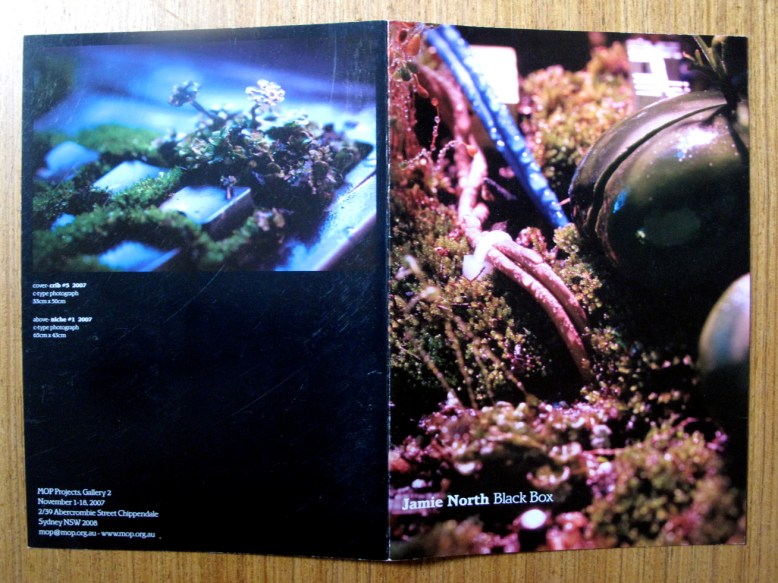The photographs in Jamie North’s new series offer up a sinister end game. Using what now appear in these works to be relics of a civilised past, a verdant species have come to thrive in the absence of human life. A pile of books, once symbols of knowledge and learning have devolved to mulch, housing native tongue orchids* and black bean**, which have taken root between their mildewed pages. A keyboard, once the crucible of communication and exchange, a device that orchestrates capital and conducts friendships, has sprung moss and liverworts from between its keys. Are these theatrical sites of decay and new growth a construct, or an accidental discovery? Are these plants that appear parasitic, carnivorous even, actually being sustained by their unlikely compost? From within the apparatus of a redundant computer monitor the ‘new world’ of the black bean plants and tarzan vine*** seems aggressive and established, a new colony of super-dwellers—could it be that these shiny, sensual plants are being nourished by battery acid?
